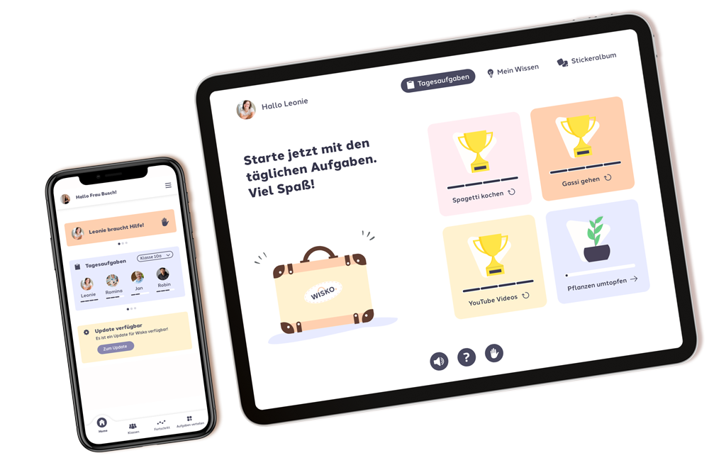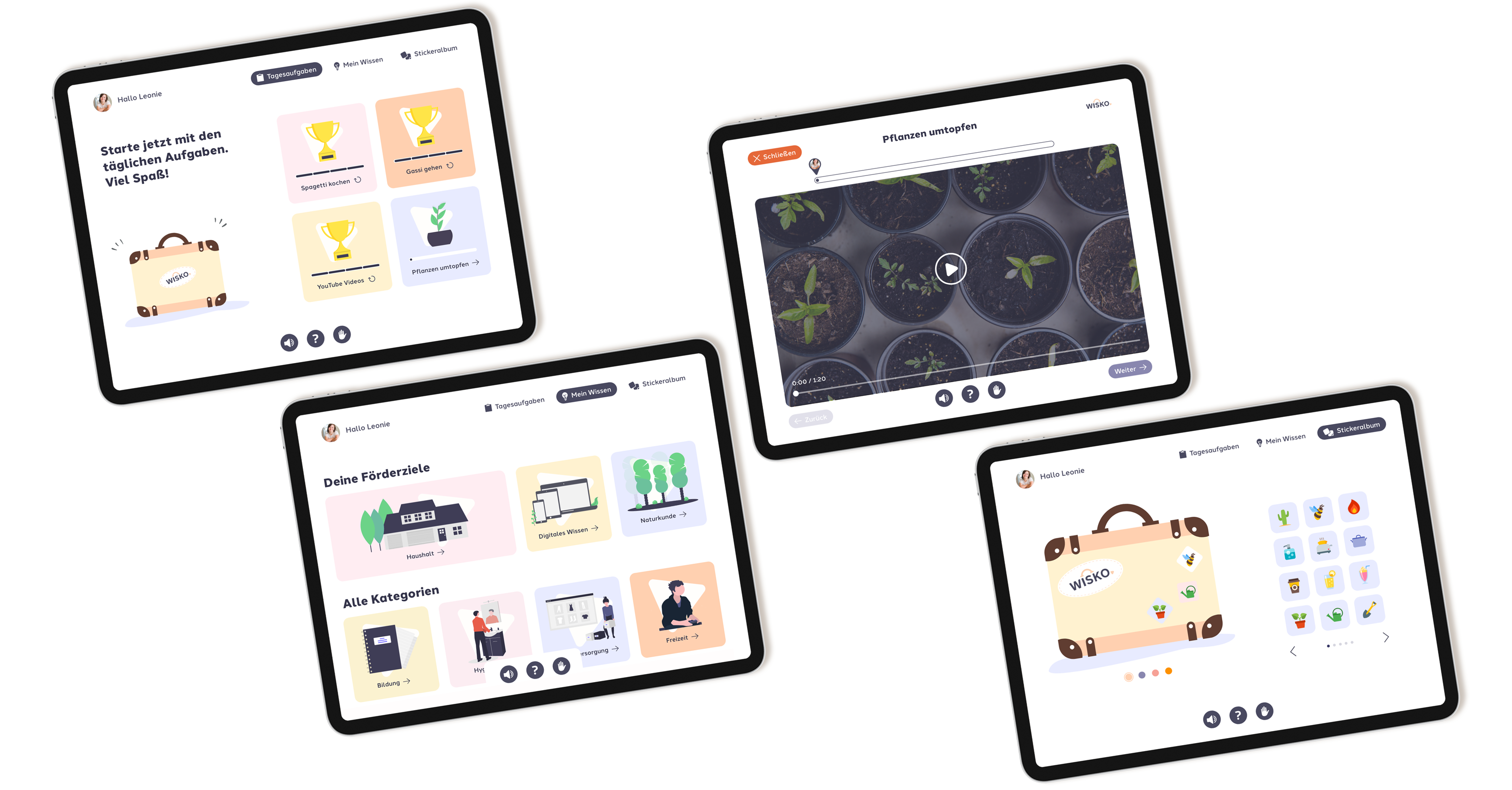 WISKO – Dein Wissenskoffer begleitet Menschen mit geistiger Beeinträchtigung als ein Repertoire an Situations- und Alltagskompetenzen zum Nachschlagen, Wiederholen und Üben von der Schulzeit bis ins spätere Leben. WISKO bereitet durch das individuelle Freischalten von spielerischen, kleinschrittigen Aufgaben auf ein selbstbestimmteres Leben mit sozialer Teilhabe vor.